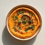 Keywords: roasted red pepper hummus, easy hummus recipe, 5 ingredient hummus, roasted pepper dip, vegan hummus, healthy snack