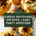 These Artichoke Dip Bites are a delicious appetizer featuring a creamy, cheesy artichoke filling nestled in flaky puff pastry. Perfect for parties or gatherings, they combine the tanginess of artichokes with rich cream cheese, mozzarella, Parmesan, and subtle spices, baked to golden perfection and garnished with crispy bacon and fresh parsley.