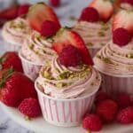 9. Garnish: Top each cupcake with one fresh strawberry, one fresh raspberry, and a sprinkle of chopped pistachios for added texture and flavor.