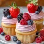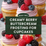 This Berry Buttercream Frosting is a luscious and vibrant frosting made by blending fresh blackberries, strawberries, and blueberries with creamy butter and powdered sugar. Perfect for topping cupcakes or cakes, it adds a natural fruity sweetness and a beautiful pastel hue to your baked treats. Topped with fresh mixed berries, it offers a delightful, fresh finish that’s both visually appealing and delicious.