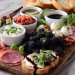 - Serve and Enjoy: Invite guests to build their own bruschetta creations using the assortment of bread, toppings, cheeses, and meats. Try suggested combinations like fresh tomato bruschetta with burrata and prosciutto or goat cheese with blackberry jam and honey for a flavorful experience.
