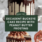 Decadent Buckeye Cake combines rich chocolate layers with creamy peanut butter buttercream frosting and a smooth chocolate ganache drip. Inspired by the classic buckeye candy, this cake is layered with peanut butter bits and drizzled with ganache for an indulgent treat perfect for celebrations or any special occasion.