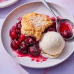 This Buttermilk Biscuit Cherry Cobbler features a luscious, bubbling cherry filling topped with soft, golden buttermilk biscuit dough. Perfectly spiced with cinnamon and accented by almond extract and lemon juice, this comforting dessert is easy to prepare and delightful served warm with vanilla ice cream.