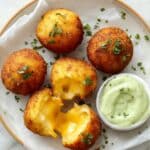 Potato croquettes with cheese are crispy on the outside and irresistibly creamy inside. These golden bites are packed with smoky and sharp cheeses, seasoned with warm spices, and served with a vibrant hatch chili sauce for an extra kick.