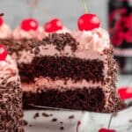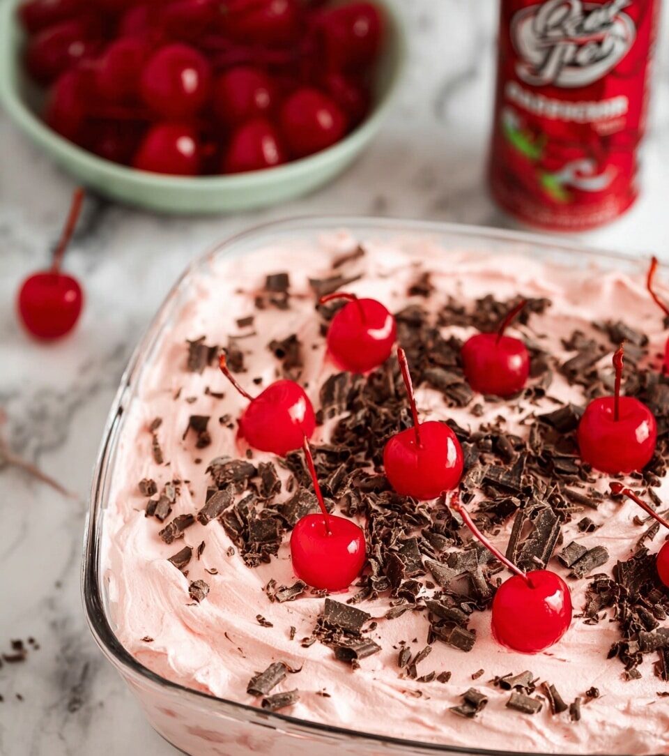 This Cherry Dr Pepper Cake is a moist and flavorful chocolate cake infused with cherry-flavored soda and studded with maraschino cherries. Topped with a rich cherry frosting made from reserved cherry juice and butter, this indulgent dessert is garnished with chocolate shavings and extra cherries for a delightful presentation and taste.