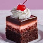 - Slice and garnish: Remove the cake from the freezer. Using a warm knife (dip in warm water and dry between cuts), slice the cake into neat squares. Garnish each piece with a fresh or maraschino cherry. Serve with optional whipped cream.