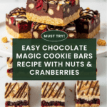 Chocolate Magic Cookie Bars are a delicious layered treat that combine a buttery graham cracker crust with sweetened condensed milk, chocolate, nuts, dried cranberries, and coconut. These bars are easy to make and perfect for satisfying your sweet tooth with a mix of textures and flavors.