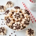 - Step 4: Fill a piping bag fitted with a large star tip (or a ziplock bag with a corner cut off). Pipe cookies that are about 1½ inches wide, spacing them 1 inch apart on the parchment. Hold the bag vertically about ½ inch above the paper, squeeze gently to form the size, then release pressure and pull straight up. Sprinkle a few mini chocolate chips on top of each cookie.