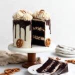 This decadent Chocolate Stout Layer Cake combines rich dark cocoa with the deep, robust flavor of Guinness stout beer, enhanced by a touch of espresso powder. Layers of moist cake are paired with a luscious Bailey’s Irish Cream buttercream frosting and a smooth chocolate ganache drip, crowned with a crunchy topping of crushed pretzels for a delightful texture contrast.