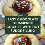 These Chocolate Thumbprint Cookies feature a tender buttery base with a rich hot fudge filling and festive Christmas sprinkles. Perfect for holiday gatherings, they are baked in a mini muffin tin to create adorable, bite-sized treats that are both delicious and visually appealing.