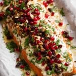 This Christmas Baked Salmon recipe features a succulent side of salmon glazed with a buttery honey sauce, baked to perfection, then broiled for a beautiful caramelized finish. Topped with a creamy dill sauce and a festive holiday tapenade of plumped dried cranberries, toasted almonds, fresh herbs, and pomegranate seeds, this dish is perfect for special occasions. It serves as a warm, elegant centerpiece that is both flavorful and visually stunning, best enjoyed slightly warm or at room temperature.