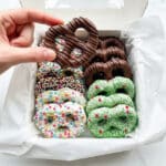 - Add Sprinkles (Optional): While the chocolate is still wet, sprinkle your choice of decorative sprinkles over the coated pretzels to add color and texture.