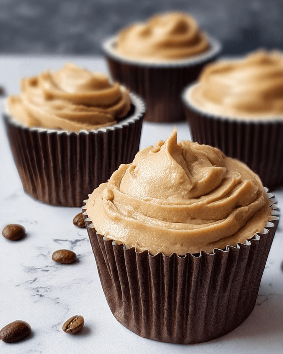 Four cupcakes are shown on a white marbled surface with coffee beans scattered near them. Each cupcake is in a dark brown paper liner with visible vertical folds. The cupcakes have one thick layer of light brown frosting swirled on top, with a creamy and slightly textured look. The frosting is piled high and the focus is on the closest cupcake in the front, while the other three are slightly out of focus in the background. The overall color scheme is warm with shades of light brown and dark brown. Photo taken with an iphone --ar 4:5 --v 7