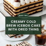 This Cold Brew Icebox Cake is a delightful no-bake dessert that combines rich mascarpone cream with the bold flavor of cold brew coffee. Layered with crisp Oreo Thins and topped with chocolate-covered espresso beans, it’s a perfect treat for coffee lovers.