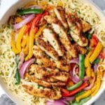 11. Combine and Serve: Plate the sauce-coated pasta and top with the cooked chicken strips and sautéed peppers and onions.