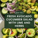 A refreshing and vibrant avocado salad featuring ripe avocados, crisp cucumbers, and a zesty lime dressing enhanced with fresh herbs and subtle heat from chili flakes. Perfect as a light side dish or a healthy snack.
