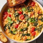 This Creamy Tuscan White Bean Skillet is a comforting and flavorful vegetarian dish made with tender cannellini beans simmered in a rich Parmesan and cream sauce with garlic, cherry tomatoes, and fresh spinach. Paired with crispy golden toasted white country bread and fragrant basil, it’s a perfect hearty meal for any time of day.