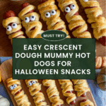 Keywords: mummy hot dogs, crescent dough hot dogs, Halloween snacks, kid-friendly appetizer, spooky appetizer, crescent roll recipes