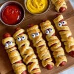 Keywords: mummy hot dogs, crescent dough hot dogs, Halloween snacks, kid-friendly appetizer, spooky appetizer, crescent roll recipes