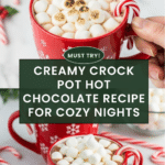- Serve: Ladle the hot chocolate into mugs. Top with mini marshmallows, whipped cream, and a mini candy cane if desired for a festive touch.