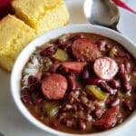 - Step 6: Place your desired amount of rice in a bowl and top with the red beans and sausage mixture.