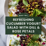 A refreshing and flavorful Cucumber Yogurt Salad featuring the creamy texture of Greek yogurt combined with the crispness of Persian cucumbers, infused with fresh dill, dried mint, and aromatic rose petals. Topped with crunchy pistachios and tart dried sour cherries, this salad is a perfect light dish for warm weather or as a vibrant side.