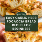 This easy focaccia bread recipe combines aromatic garlic and herbs infused olive oil with a soft, pillowy dough. Perfect as a flavorful side or base for toppings, this homemade focaccia offers a crispy golden crust and tender interior with simple ingredients.