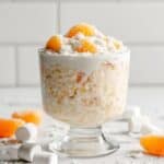 A clear glass dessert cup on a white marbled surface holds a layered creamy dish, filled with small, soft-textured grains mixed into a milky base. Scattered throughout the mixture are bright orange segments, adding pops of vibrant color inside the mostly pale cream layer. The top layer is thick and white with visible small lumps, crowned with more orange fruit pieces. Around the glass are small, white marshmallows and white flakes scattered across the surface, enhancing the soft and light theme of the scene. The background is a clean white tiled wall. Photo taken with an iphone --ar 4:5 --v 7