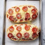 - Top with cheese and pepperoni: Evenly distribute the shredded mozzarella cheese, pepperoni slices, and Parmesan cheese over the sauced bread halves.
