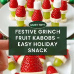 These Grinch Fruit Kabobs are a fun and festive treat perfect for holiday parties or a healthy snack that kids will love. With a colorful combination of grapes, bananas, strawberries, and marshmallows, they’re as delightful to look at as they are to eat.