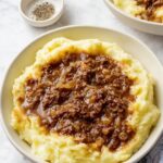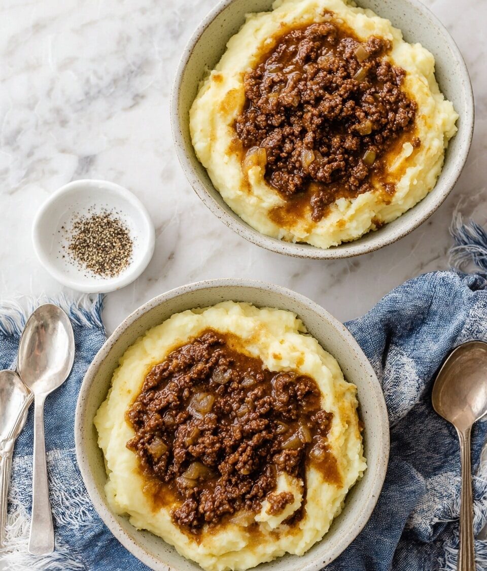 - Serve: Divide the mashed potatoes evenly between serving bowls. Spoon the ground beef and gravy over the potatoes. Serve warm and offer extra gravy on the side if desired.