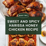 This Harissa Honey Chicken recipe features tender, juicy boneless skinless chicken thighs marinated in a vibrant blend of spicy harissa paste, sweet honey, tomato paste, and aromatic spices. Baked to perfection with a caramelized, slightly charred surface, this dish offers a delightful balance of heat, sweetness, and smokiness that’s perfect for a flavorful weeknight dinner or entertaining guests.