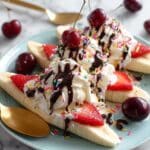 A healthier twist on the classic banana split featuring homemade banana ice cream made with frozen bananas and almond milk. This recipe includes two delicious variations: a classic banana split loaded with fresh fruit, coconut whipped cream, and dark chocolate drizzle, and a s’mores-inspired banana split with toasted marshmallows, crushed graham crackers, and chocolate. Both are naturally sweet, dairy-free, and perfect for a guilt-free dessert treat.
