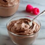 The image shows a clear glass bowl filled with a smooth, creamy chocolate mousse that has a soft and fluffy texture, with gentle swirls and peaks on its surface. A silver spoon is placed inside the bowl, partially submerged in the mousse with a scoop taken out, showing the mousse’s light and airy consistency. In the background, there is another bowl of the same mousse and two bright red raspberries placed on a white marbled surface, adding a pop of color to the scene. Photo taken with an iphone --ar 4:5 --v 7
