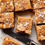 - Rest and Serve: Let the blondies rest in the pan for 10 minutes, then lift onto a cutting board. Allow them to cool at least another 10 minutes to set properly. Sprinkle sea salt flakes on top if desired. Cut into 16 small squares or 9 larger squares and enjoy!