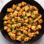 The image shows a black cast iron skillet filled with bite-sized chicken pieces cooked to a golden brown color with a shiny glaze. The chicken pieces are uneven in shape and spread evenly across the skillet’s surface, each piece coated in a glossy sauce that pools slightly at the bottom. Bright green sliced scallions are scattered on top, adding a fresh pop of color. The skillet is set against a white marbled texture background with a small part of a woman's hand holding the skillet handle visible at the top left corner. photo taken with an iphone --ar 4:5 --v 7