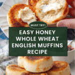 These Honey Whole Wheat English Muffins are homemade delights made using a bread machine dough cycle, featuring a combination of white whole wheat and all-purpose flours sweetened with honey. They are cooked on a skillet for a golden crust and finished in the oven for perfect texture. The result is fluffy muffins with characteristic nooks and crannies to hold butter or jam, ideal for breakfast or snacks.
