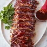 8. Apply BBQ sauce: Remove ribs carefully and place on a large foil-lined baking sheet. Generously slather ribs with barbecue sauce.