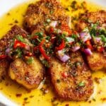 These Italian Crusted Sardines feature butterflied sardines coated with a flavorful crust of panko breadcrumbs, pecorino cheese, toasted pinenuts, garlic, anchovies, capers, lemon zest, and herbs, pan-fried to crispy perfection. Topped with a spicy red onion, chili, and parsley mixture, they make a deliciously vibrant and satisfying appetizer or light meal, ideal served with crostini for classic sardines on toast.