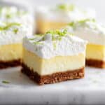 These Key Lime Pie Bars are a refreshing twist on the classic dessert, combining a tangy lime filling with a buttery graham cracker crust. Topped with fluffy whipped cream, they make the perfect sweet and tart treat for any occasion.