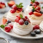 Mini Pavlovas are delightful individual meringue nests topped with whipped cream and fresh fruit. Light, crispy on the outside, and soft inside, they make a perfect elegant dessert for any occasion.