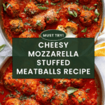 Mozzarella Stuffed Meatballs are juicy beef meatballs filled with melted mozzarella cheese, seasoned with Italian herbs, and baked to perfection. Served with marinara sauce and spaghetti noodles, this comforting Italian-American classic brings rich flavors and cheesy goodness to your dinner table.