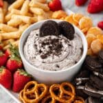 Delicious and creamy Oreo Dip made with whipped cream, cream cheese, and crushed Oreos, perfect for dipping with strawberries, pretzels, nilla wafers, and more. This no-bake treat is easy to prepare and ideal for parties or casual snacking.