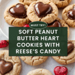 Delight in these soft and chewy Peanut Butter Heart Cookies featuring a perfect blend of creamy peanut butter, brown sugar, and granulated sugar. Each cookie is topped with a classic Reese’s Peanut Butter Heart candy, making them ideal for peanut butter lovers and perfect for festive occasions or everyday treats.