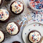 - Frost and Garnish: Transfer the prepared frosting to a piping bag or a zip-top plastic bag with a corner cut off. Pipe frosting over cooled cupcakes. Finish with red, white, and blue sprinkles if desired for a festive touch.