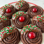 Delightfully rich and tender Piped Chocolate Butter Cookies crafted with cocoa powder and a hint of espresso for depth. These elegant cookies are piped into charming swirls, optionally topped with maraschino cherries or chocolate and sprinkles. Perfectly buttery and chocolatey, they offer a delightful treat for any occasion.
