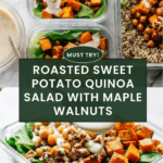 Keywords: quinoa salad, sweet potato salad, roasted chickpeas, maple walnuts, healthy salad, vegetarian, roasted vegetables