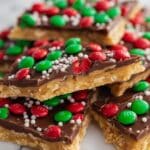 Keywords: Ritz cracker toffee, caramel toffee, easy dessert, chocolate caramel, holiday treats, crunchy toffee
