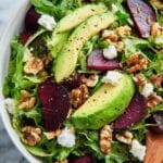A vibrant and healthy Roasted Beet & Goat Cheese Salad featuring tender roasted beets, fresh arugula, creamy avocado, tangy goat cheese, and crunchy toasted walnuts, all tossed in a flavorful balsamic vinaigrette. Perfect as a light lunch or a sophisticated side dish.