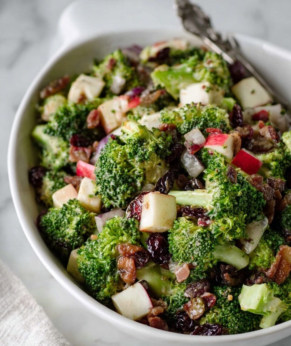A vibrant and flavorful Roasted Broccoli Salad combining tender roasted broccoli florets with sweet apples, crunchy bacon, nuts, cranberries, and a tangy honey-mustard dressing. Perfect as a refreshing side dish or light lunch.